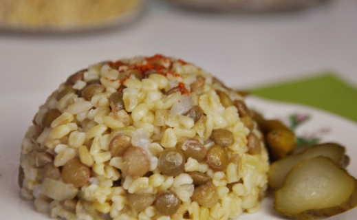 Mercimeğinizi yıkayarak,hafif yumuşayıncaya kadar haşlayın(mercimekleriniz tam açılmasın).Süzerek,haşlama suyunu kenara alın..İnce yemeklik doğranmış soğanı sıvı yağ ile pişirme tencerenize alın.Kavurun. Bulgurunuzu ekleyin,kavurmaya devam edin(1-2 dk),ardından süzülmüş yeşil mercimeği ekleyin.2 dk kadar daha kavurun.Yeşil mercimeğin suyunu ölçerek gerekiyorsa sıcak su ekleyerek 4 çay bardağı sıcak su elde edin.Kavrulmuş mercimekli soğanlı pilava ekleyin,tuzunu ayarlayın.Kapağını kapatarak önce harlı sonra, yavaş ateşte pilavınızı pişirin. Ateşten aldığınız pilava tereyağını ekleyin,karıştırın.Demlenmesi için mutfak bezinizle bohçalayarak 15 dk bekletin. Servis önerisi, Ayran ve Turşu Afiyet olsun. Not:Bu tarif evimizin bugün ne pişirelim, makarna mı haşlasak yerine tercih ettiğimiz yapımıyla pratik lezzet. Yapımda mercimek suyunu özellikle kullanıyorum,pilavınıza lezzet katar.Özellikle bayramlarda bir gün önceden pişiririm,soğuk sunmakta mümkün.Tercih sizin…