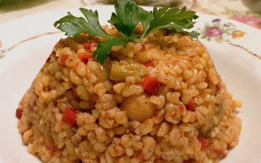 Patlıcanlar soyularak küçük küçük doğranır ve tuzlu suda 15-20dk kadar bekletilir. Soğan yemeklik doğranır ve pembeleşene kadar sıvı yağda kavrulur. Patlıcanlar süzülür ve biberlerde doğrandıktan sonra tencereye eklenir ve soğanla birlikte kavrulmaya başlanır. Sebzelerin pişmesine yakın küçük doğranmış domatesler eklenir ve tencerenin kapağı kapatılarak sebzeler pişene kadar beklenir. Domates mevsimi değilse eğer bu aşamada biraz salça eklenir ve kavrulur ancak mevsiminde domates kullanmanızı tavsiye ederim. Pişen sebzelerin üzerine yıkayıp suyunu süzdüğünüz bulgurlar eklenir, tuzu ilave edilerek, tencereye sıcak su eklenir. Pilavın üzerini örtecek kadar su yeterli olacaktır. Su miktarını ölçmeyi unuttum, bir sonrakinde yapışımda ölçüsünü belirteceğim. Tencerenin kapağı kapatılarak kısık ateşte bulgurlar şişip yumuşayana kadar pişirilir. Pilavın suyu yetersiz gelip tencerenin tabanına yapışmaması için ara sıra kontrol etmeyi unutmayın. Suyu azalmış ancak hala pişmemiş ise bir miktar daha sıcak su ekleyebilirsiniz. Ocağı kapattıktan sonra kapağın altına kağıt havlu sererek demlendirin. Nefis bir pilav, kesinlikle tavsiye ederim.